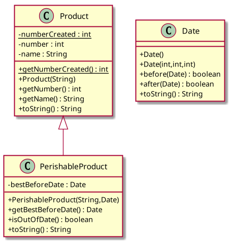 Écrivez une classe PerishableProduct qui étend la classe Product. Sa description en UML résume graphiquement toutes ses caractéristiques (cf. figure ci-dessus).
