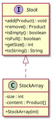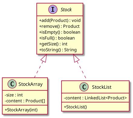 Une manière simple pour permettre l’utilisation de plusieurs formes de stock est de convertir notre classe Stock en interface. La classe Stock existante sera renommée StockArray et deviendra une réalisation de l’interface Stock sous la forme d’un tableau (voir diagramme UML suivant).
