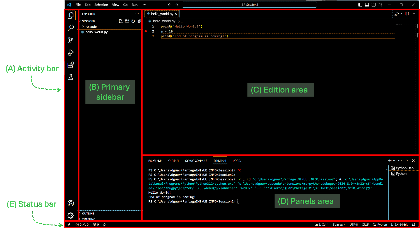 The objective of this third practical session is to gather the functionalities of all the tools we already saw (editor, interpreter) and new ones (debugger) into one software program named IDE (Integrated Development Environment).