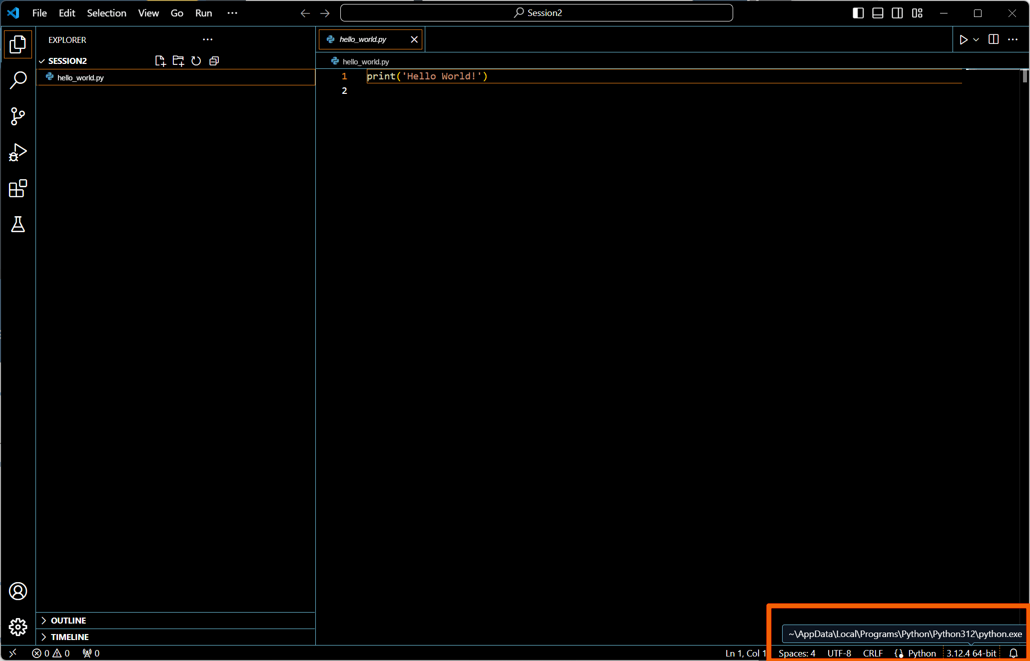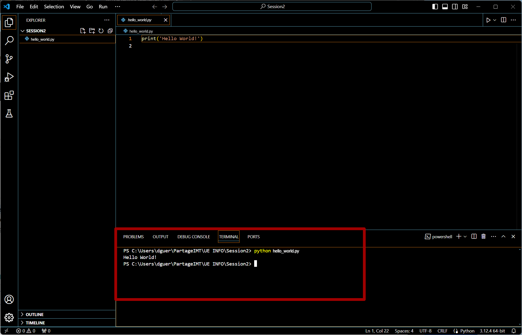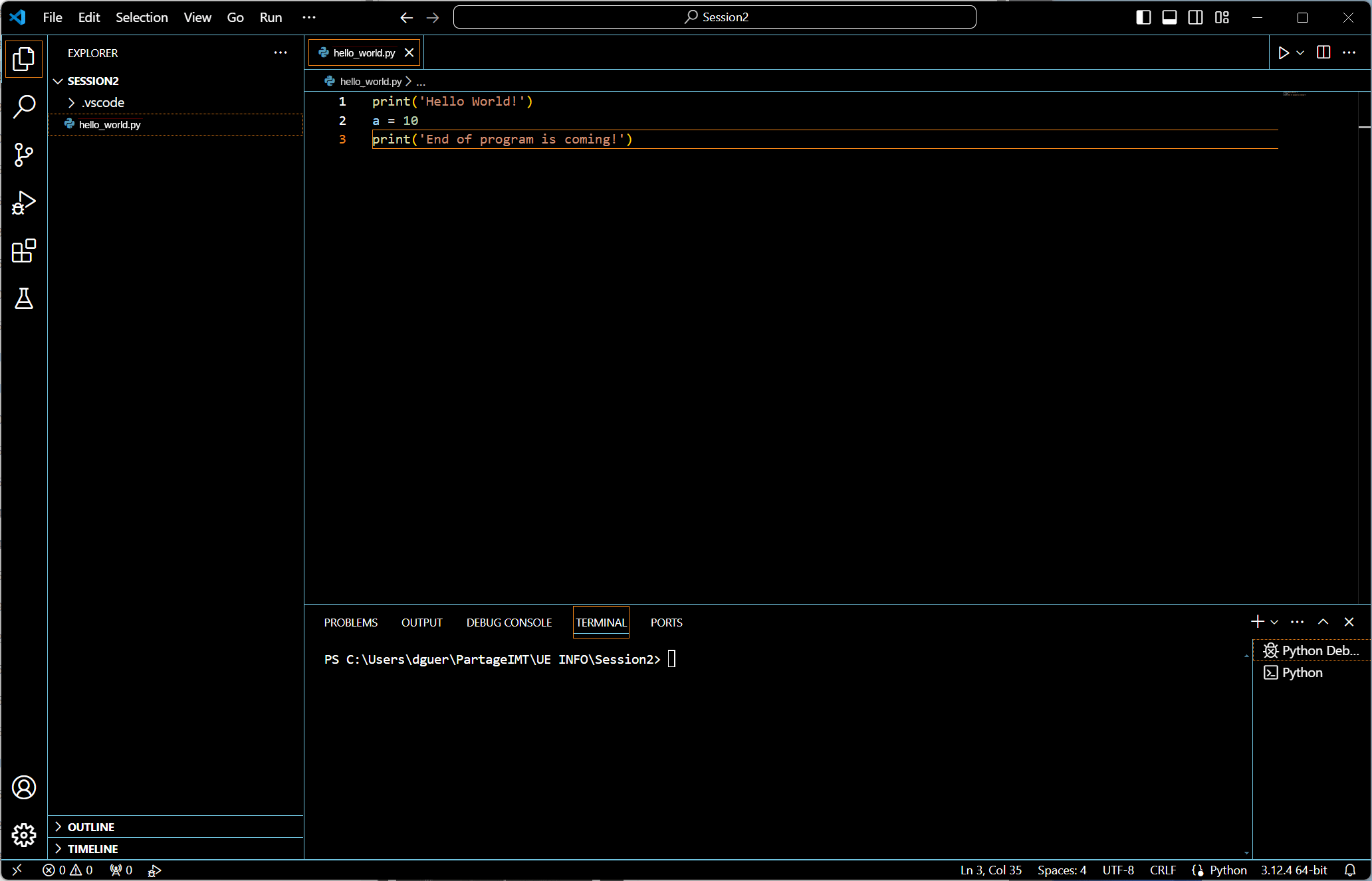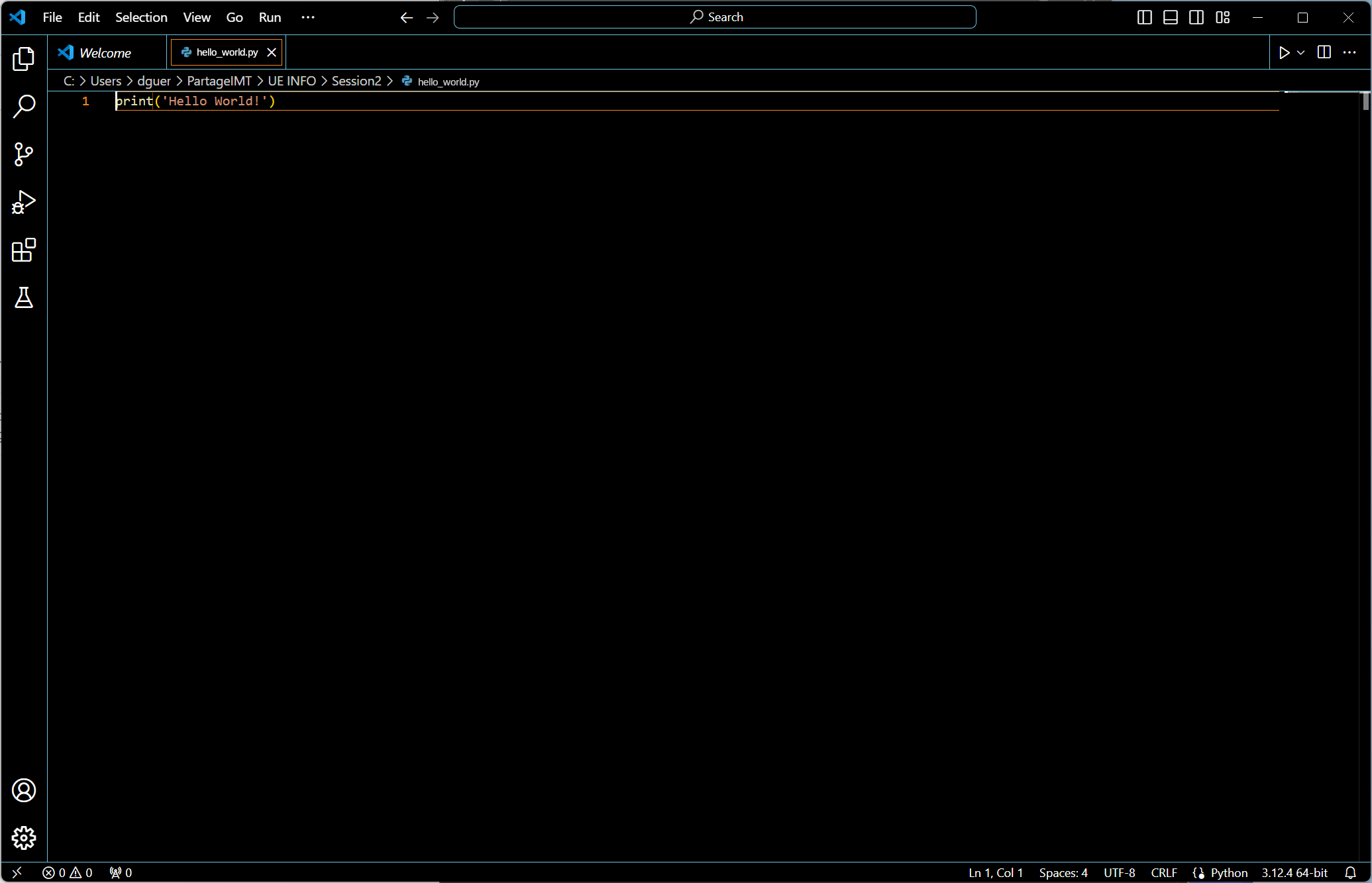 The goal is to check if your Python interpreter is working correctly. Your first program will be the traditional one that prints “Hello World!” on screen.