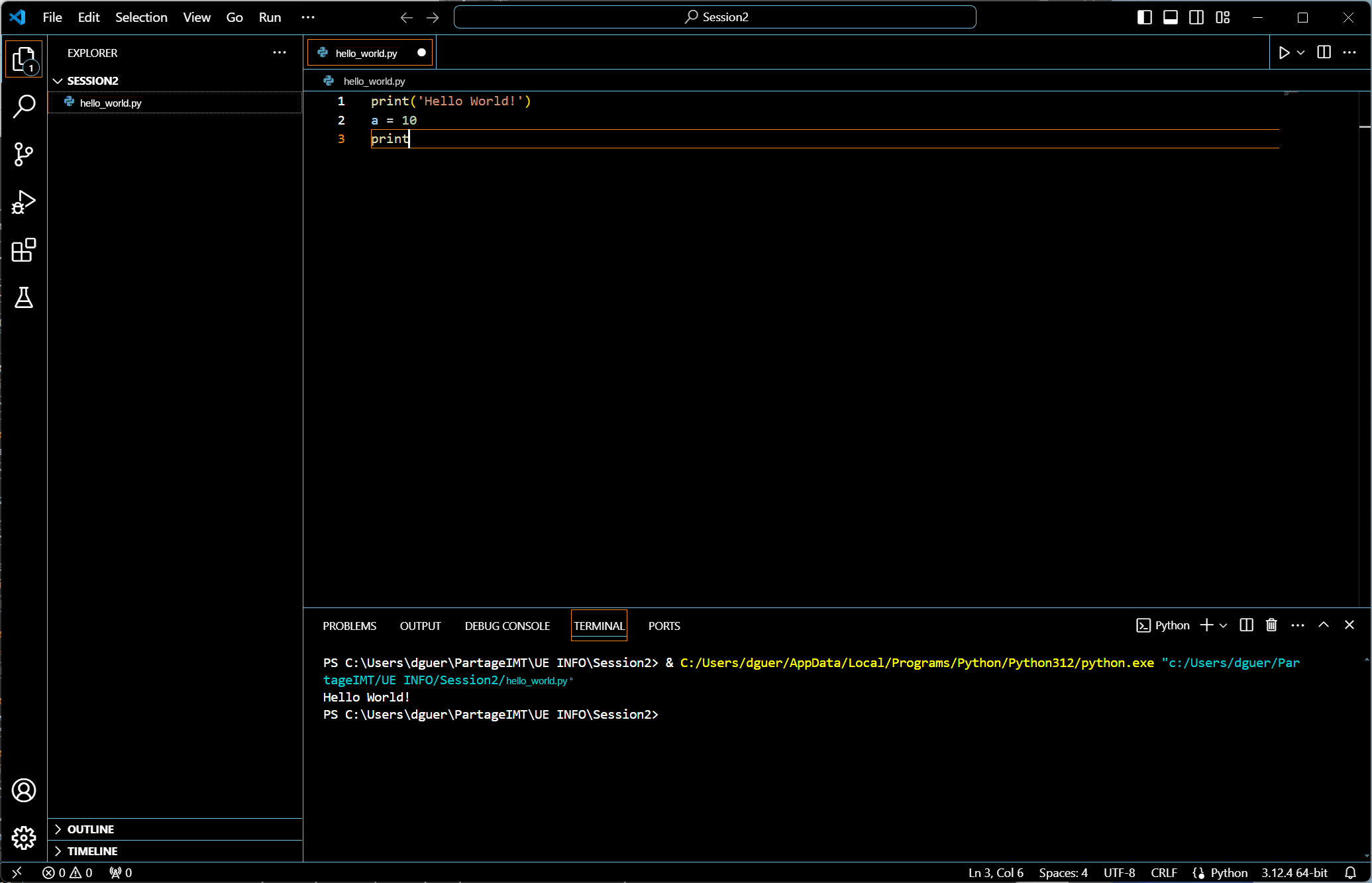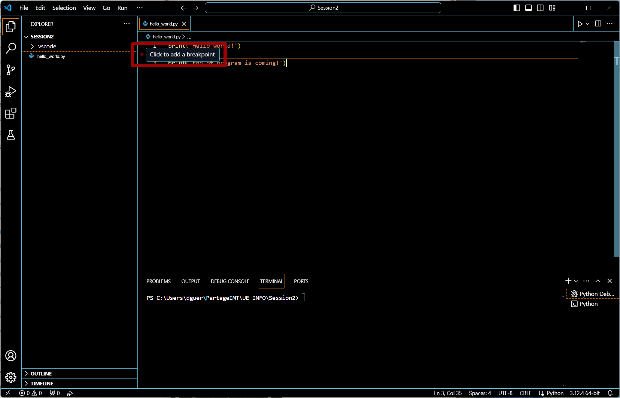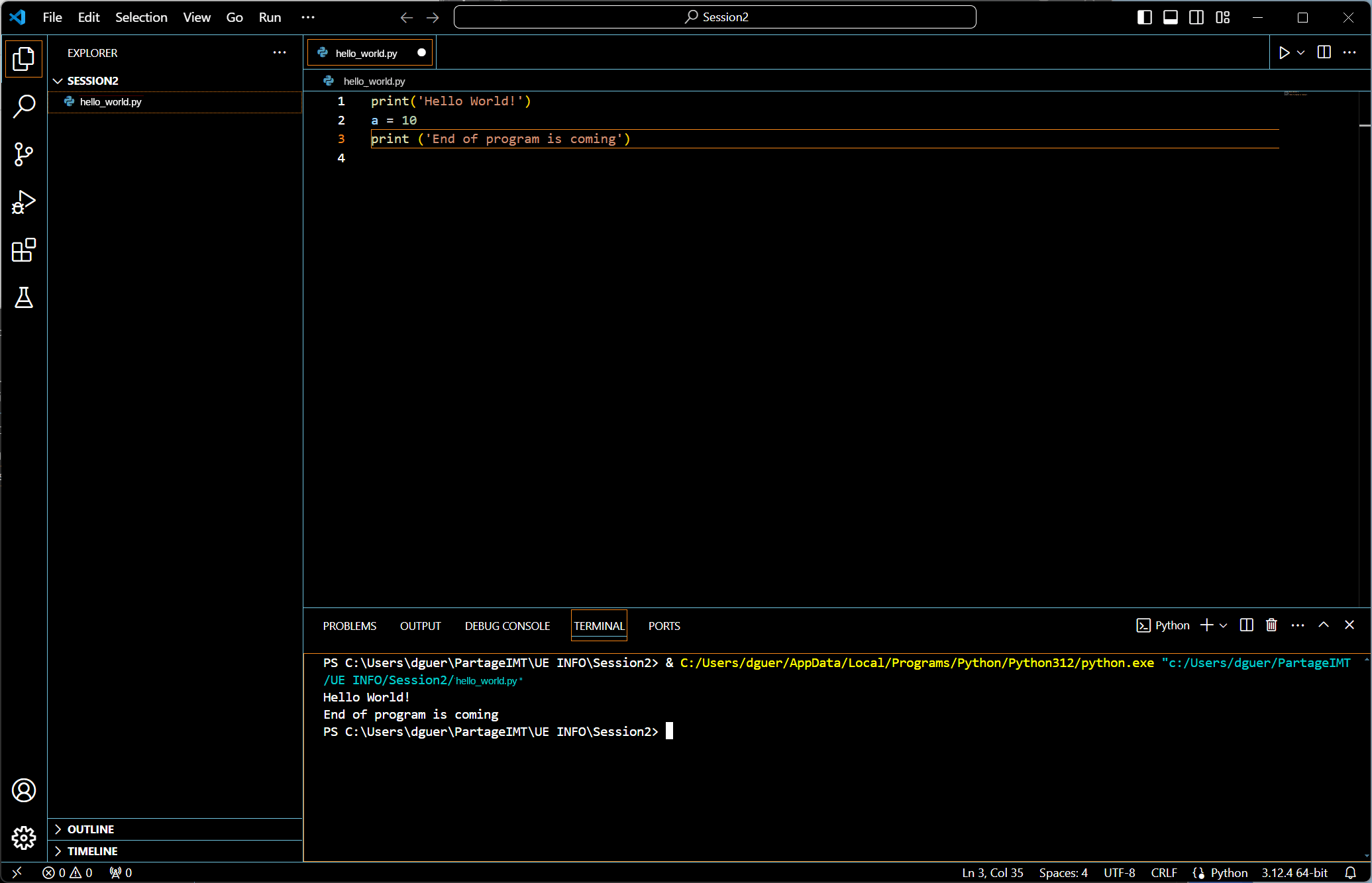 The goal is to check if your Python interpreter is working correctly. Your first program will be the traditional one that prints “Hello World!” on screen.