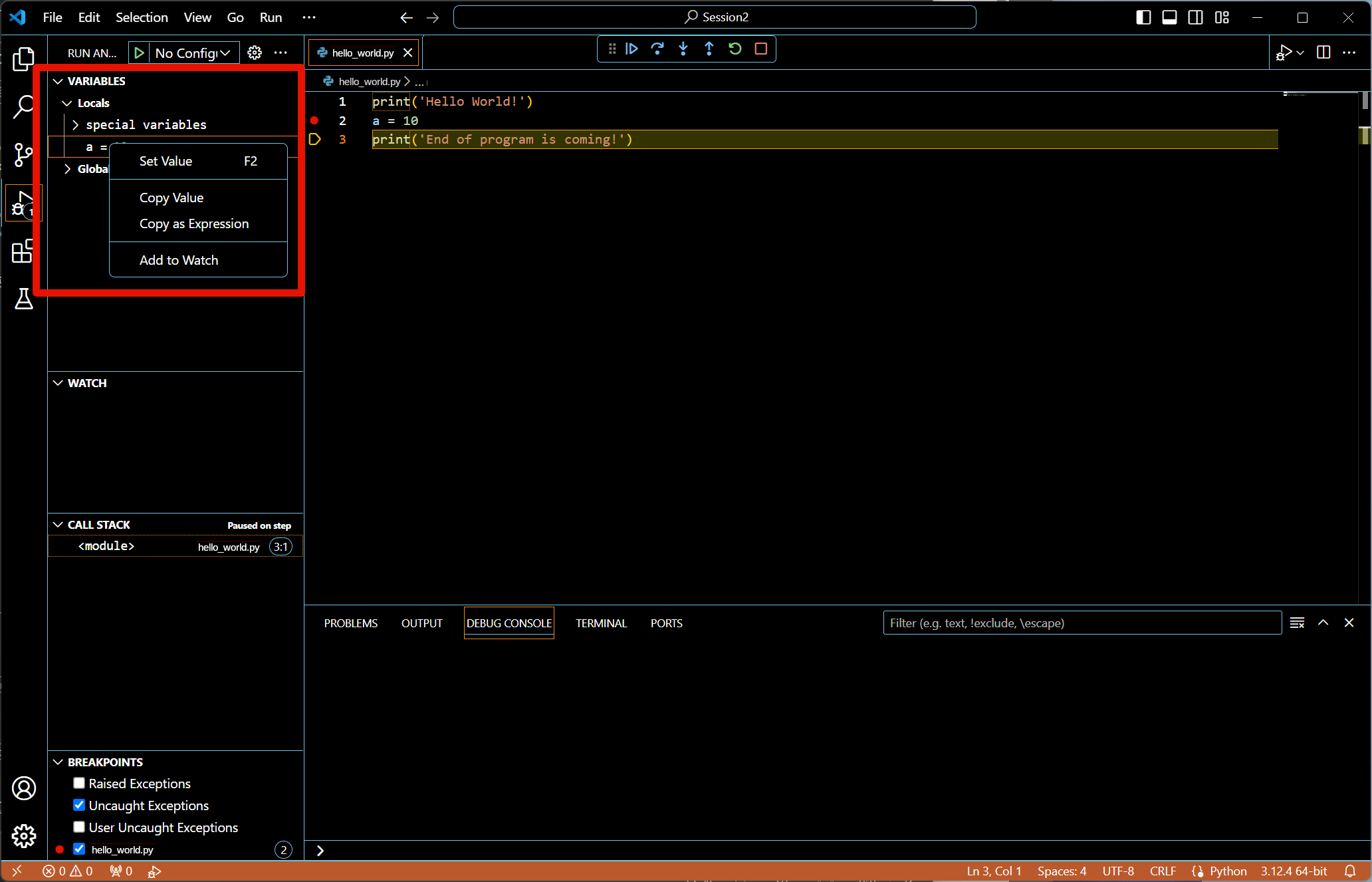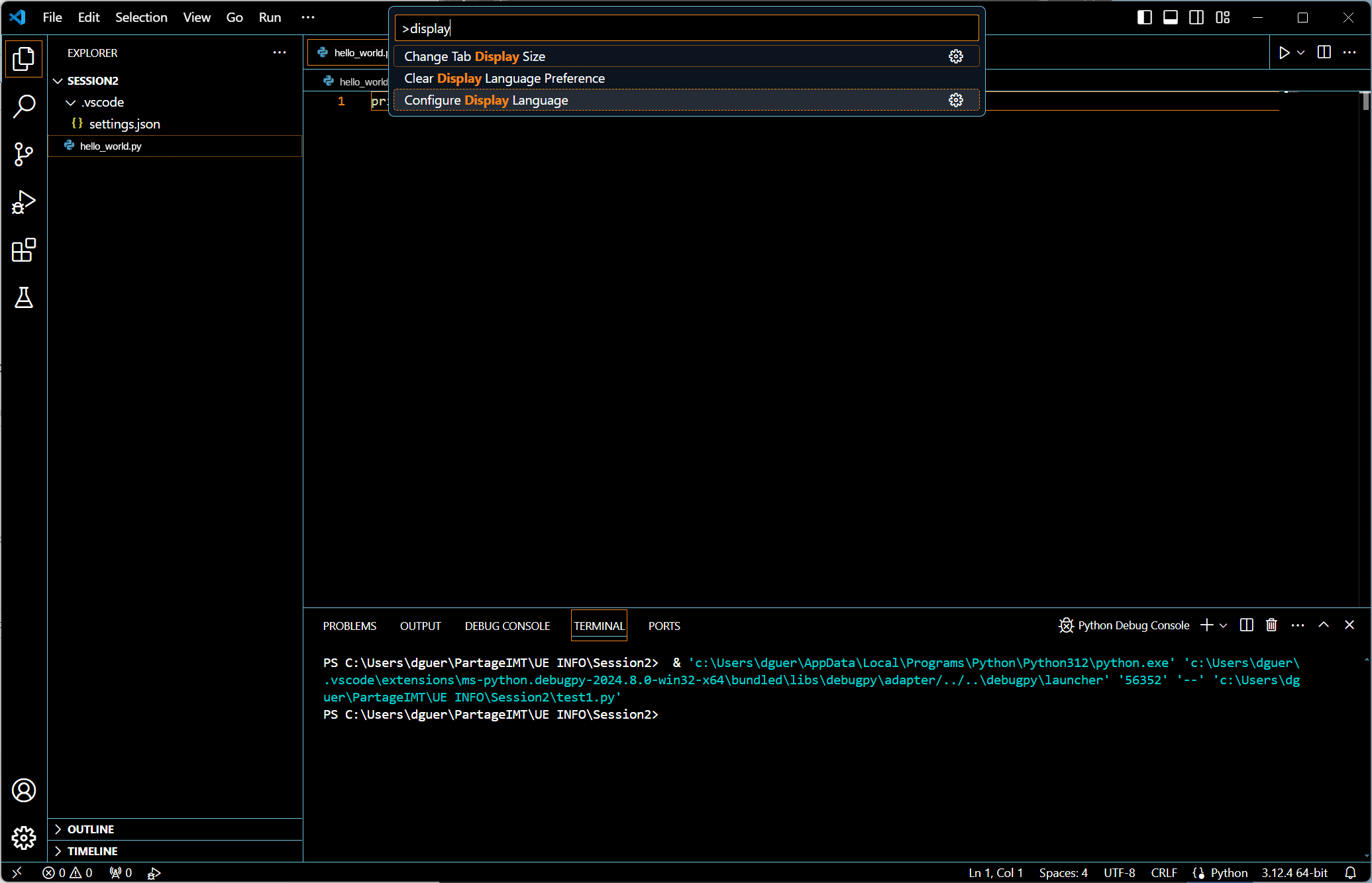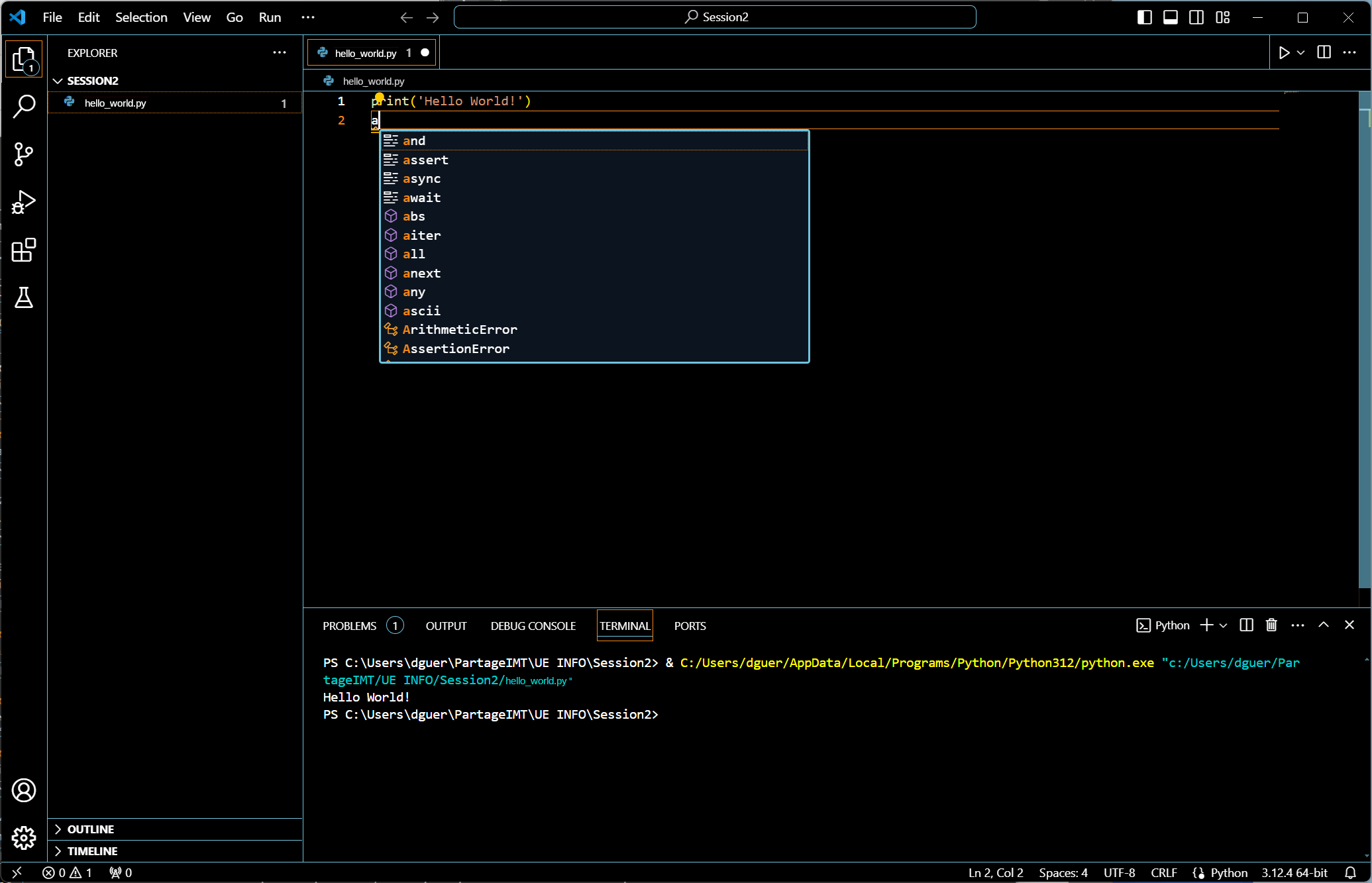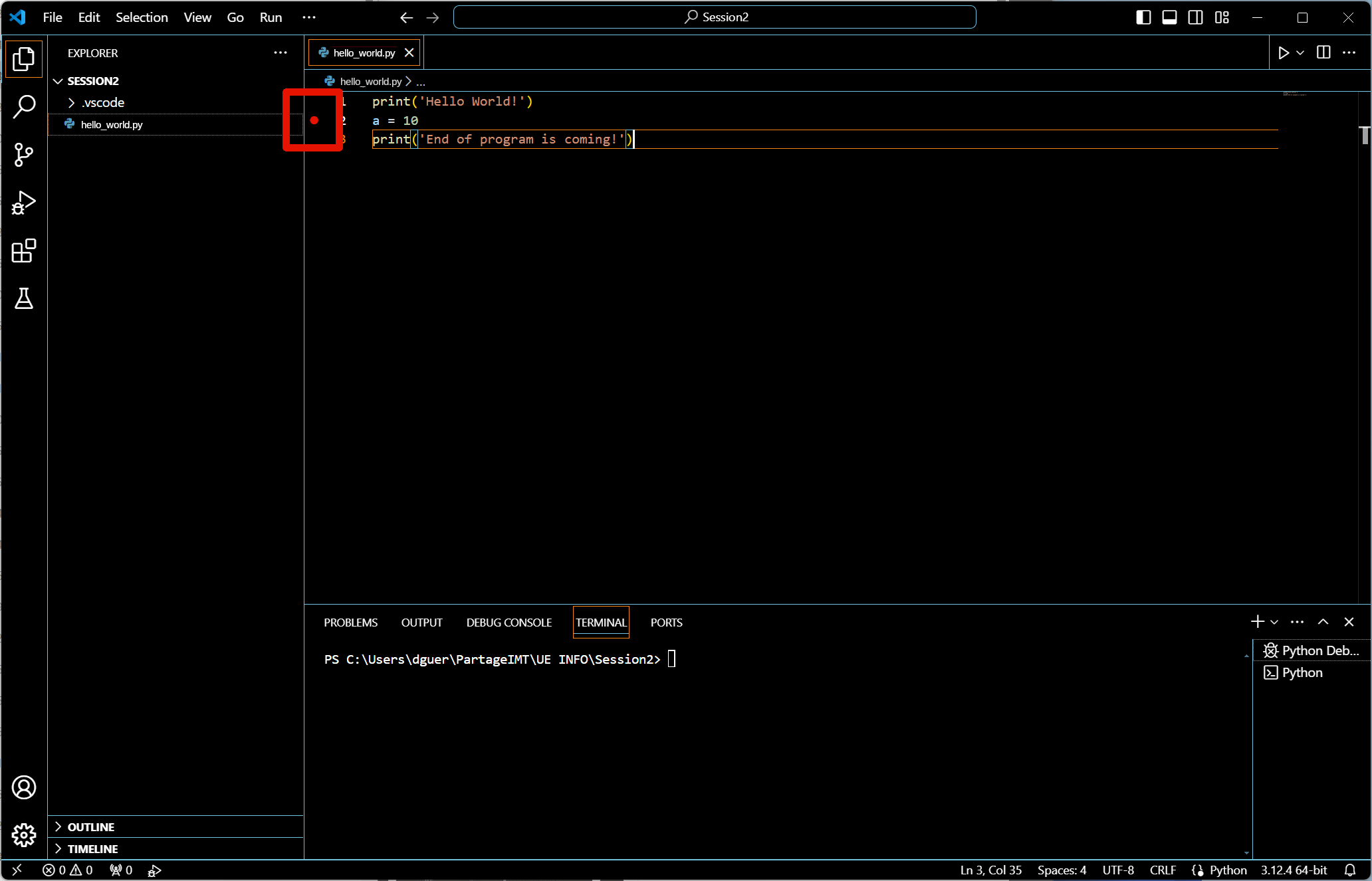 The goal is to check if your Python interpreter is working correctly. Your first program will be the traditional one that prints “Hello World!” on screen.