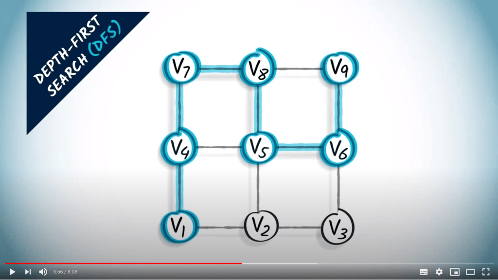 The main idea of a depth-first search is to keep exploring the graph, jumping from a given vertex to one of its unexplored neighbors. Sometimes, all neighbors of the vertex we’re in have already been explored, in which case we turn back, following the trail in the opposite direction until we find an unexplored vertex to jump to.
