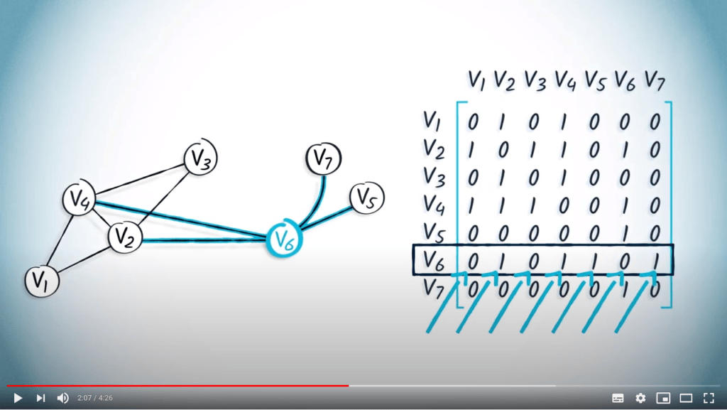 As an example, consider the following adjacency matrix: $${\bf A} = \begin{pmatrix} 0 & 1 & 0 & 1 & 0 & 0 & 0 \\ 1 & 0 & 1 & 1 & 0 & 1 & 0 \\ 0 & 1 & 0 & 1 & 0 & 0 & 0 \\ 1 & 1 & 1 & 0 & 0 & 1 & 0 \\ 0 & 0 & 0 & 0 & 0 & 1 & 0 \\ 0 & 1 & 0 & 1 & 1 & 0 & 1 \\ 0 & 0 & 0 & 0 & 0 & 1 & 0 \end{pmatrix}$$