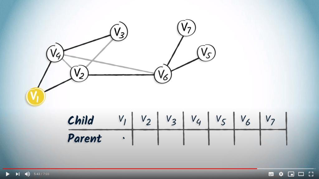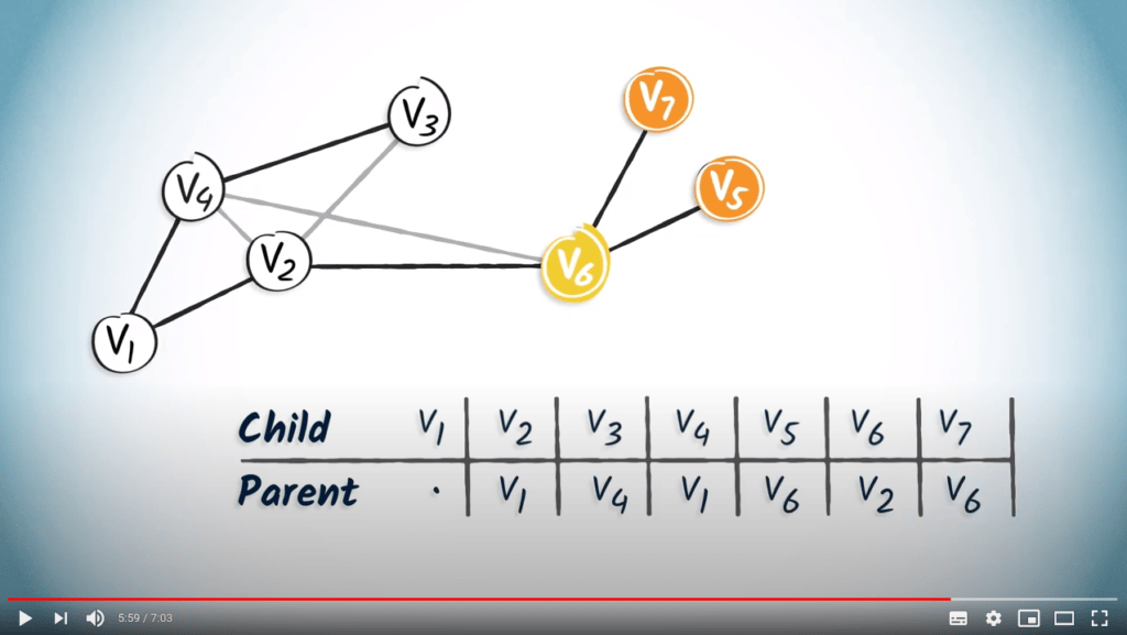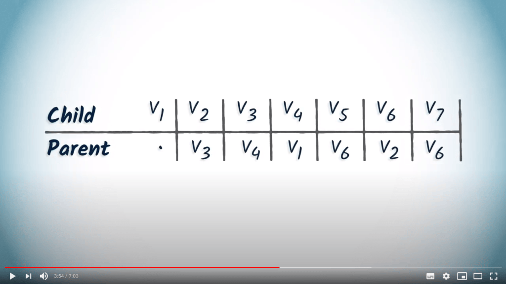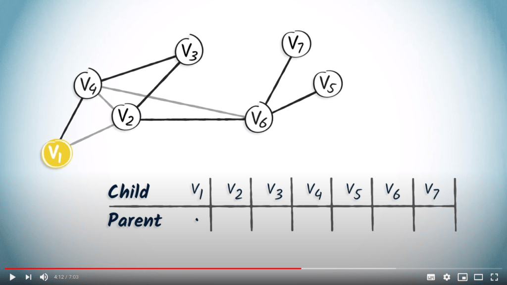 For example, if we are looking for the path from $v_1$ to $v_7$, we first read the entry corresponding to $v_7$, which is $v_6$. By definition, the parent of the destination in turn corresponds to the previous vertex in the path from $v_1$ to the destination vertex.