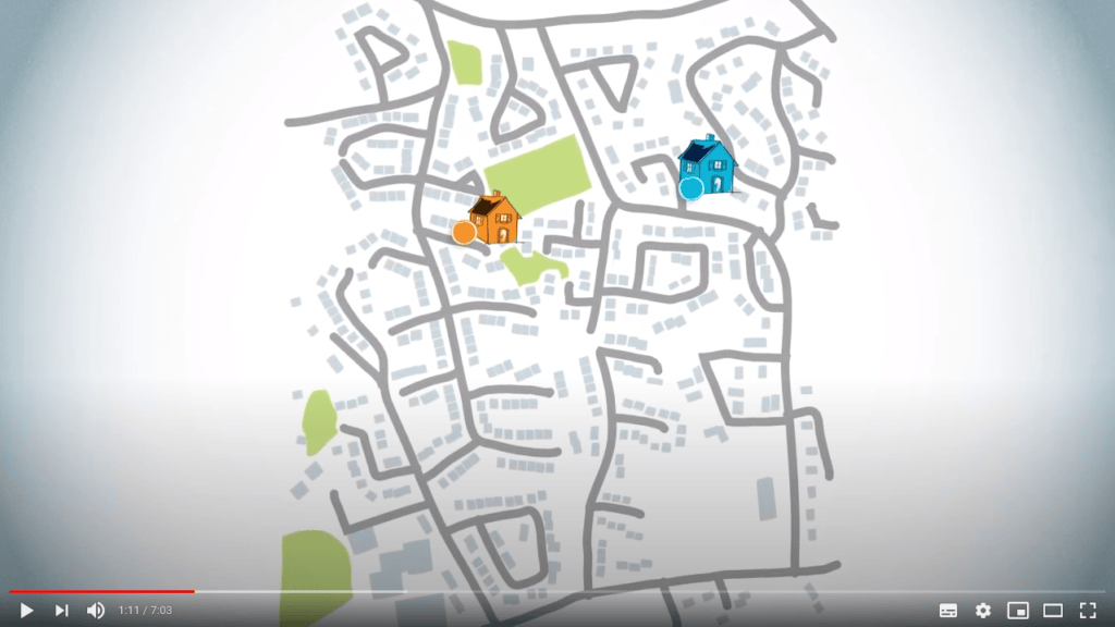 Tracing a path backwards is more intuitive than it might seem. Imagine that you, the blue circle on the map, have to drive to a friend's house, which is the orange circle on the map.