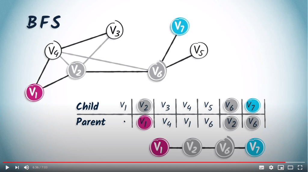 We can see that this path is shorter than the one obtained using a DFS, which was $(v_7, v_6, v_2, v_3, v_4, v_1)$. This is an important difference between DFS and BFS. BFS is a more cautious approach than DFS, as BFS gradually increases the distance from the starting position.