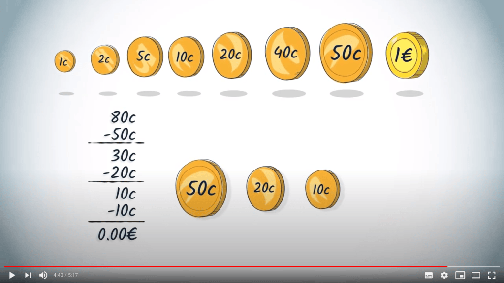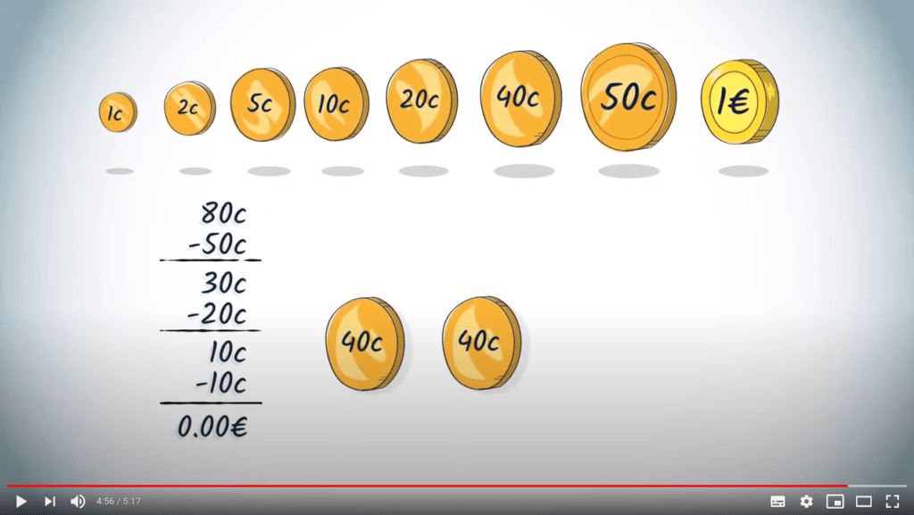 Now let us consider the following pieces: 1c, 2c, 5c, 10c, 20c, 40c, 50c, 1€, and in this case we want to return 80c.