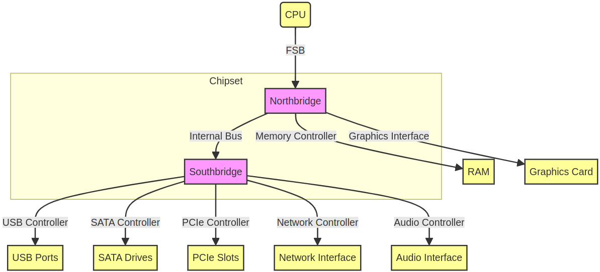 Schematic view of a chipset. InformationModern CPUs typically integrate functionalities that were traditionally part of the Northbridge directly onto the CPU die itself. This integration is known as a “System-on-Chip” (SoC) design. Overall, the integration of these functionalities onto the CPU die has led to more efficient and compact system design which simplifies motherboard designs and reduces power consumption while improving overall system performance.