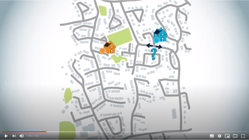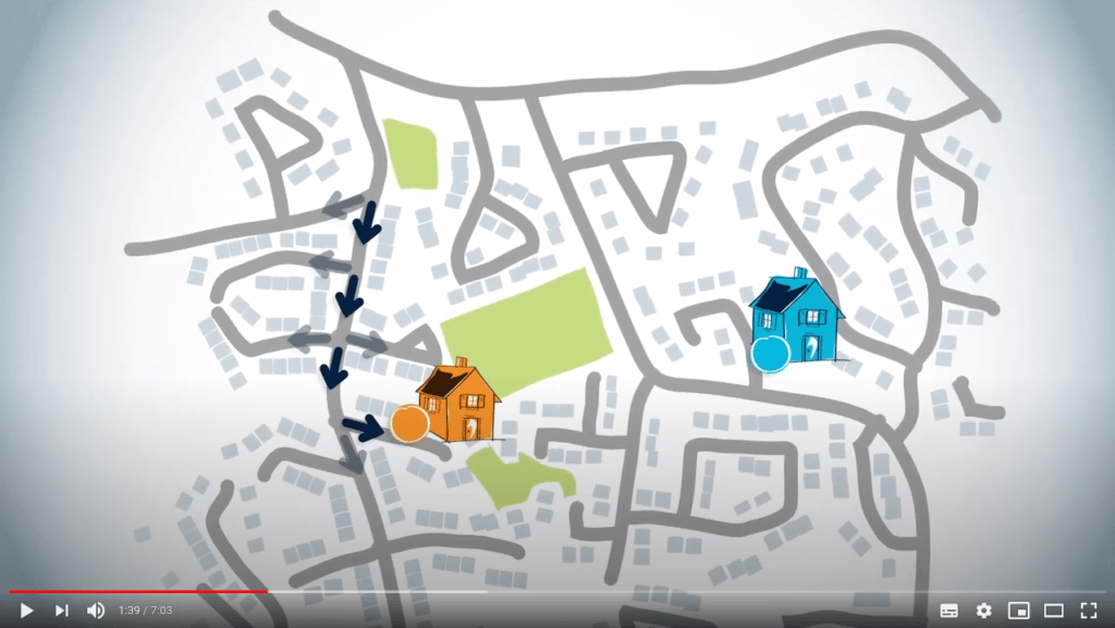 Imagine that you, the blue circle on the map, have to drive to a friend's house, which is the orange circle on the map.