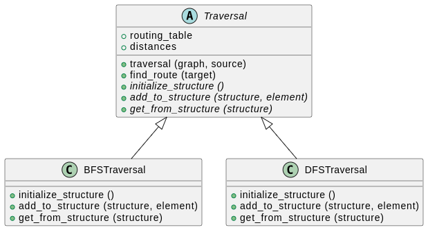 Traversalhas five methods:traversal,find_route,initialize_structure,add_to_structureandget_from_structure. Note that the last three are in italic. This means that they are “abstract methods”, i.e., they will do nothing and should be implemented in the child classes. - The arrows mean that classes
