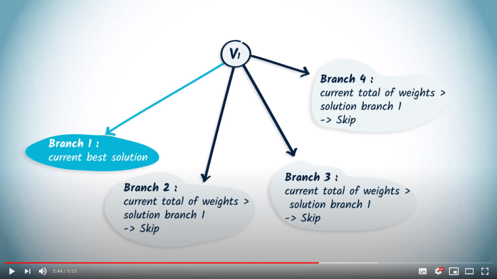 When the algorithm has determined several intervals (one per branch to explore), it can compare them to each other. In the case of searching for a path of minimum length, if the interval of a branch $b_1$ has as its upper bound a value smaller than the lower bound of an interval of another branch $b_2$, then the sub-tree corresponding to $b_2$ is eliminated. Indeed, there is no point in exploring the sub-tree $b_2$ knowing that the best solution found will in any case be less interesting than the worst ones by continuing on branch $b_1$.