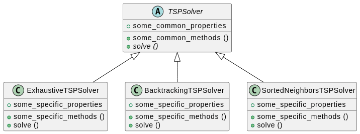 TSPSolver(in anutilsdirectory), that aggregates common methods to all exhaustive solvers. Then, write classesExhaustiveTSPSolver,BacktrackingTSPSolverandSortedNeighborsTSPSolverthat inherit fromTSPSolver. Finally, create a playerTSPPlayer.pythat exploits the solver you want.Here is a small UML diagram that represents a possible factorization. Check session 2 for a guide on how to read it.
