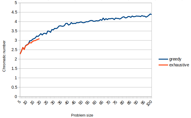 You should still note that for low problem sizes, the chromatic number found is sometimes lower than 2, which seems wrong. However, notice that the random graph generator does not check connectivity of the graph, which may lead to disconnected graphs for low vertex counts.