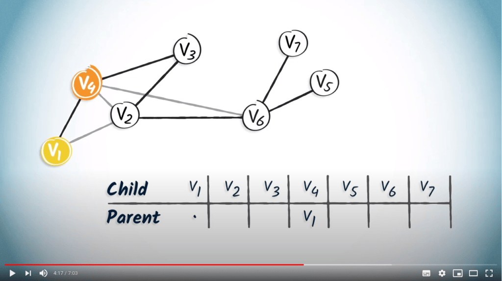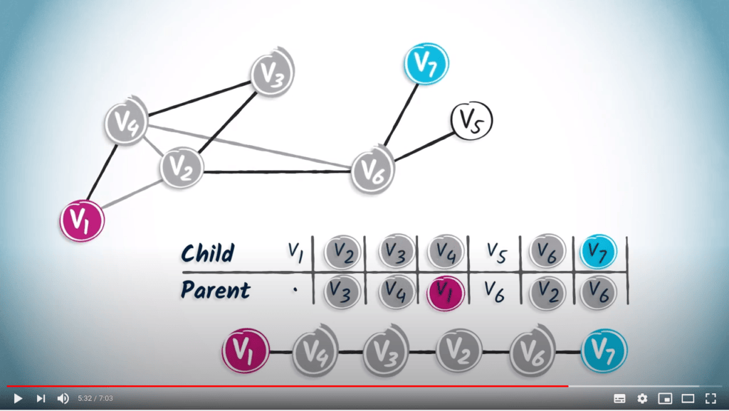 To read this table, you can simply start from the desired destination and read the corresponding entry, which refers to the parent vertex of the destination.