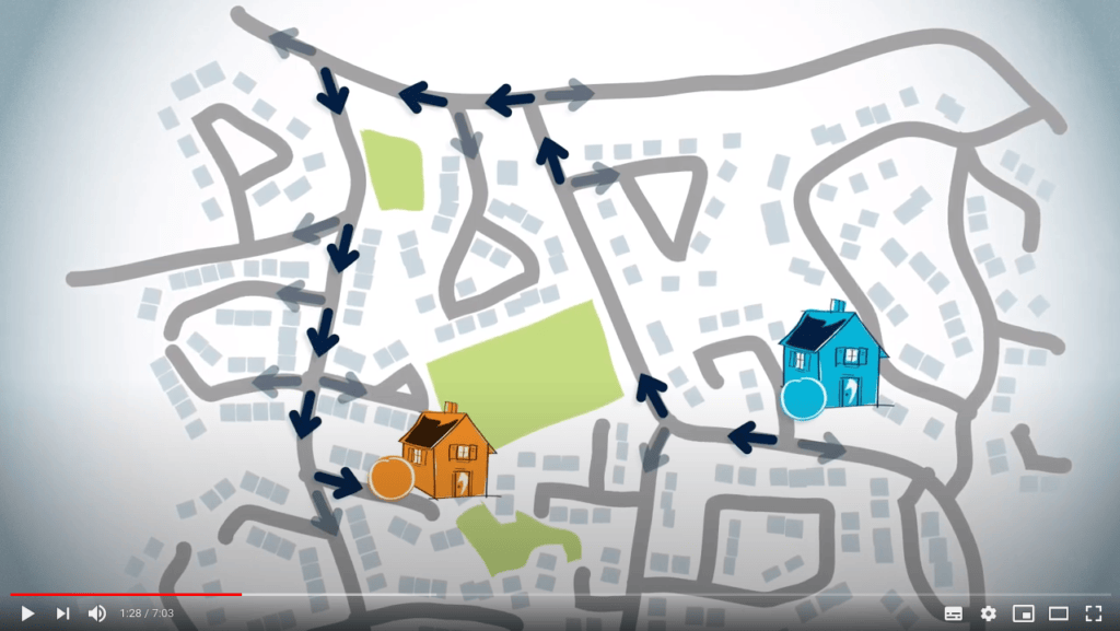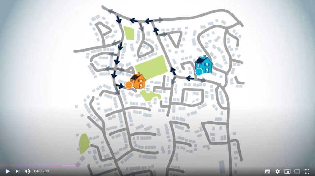 Imagine that you, the blue circle on the map, have to drive to a friend's house, which is the orange circle on the map.