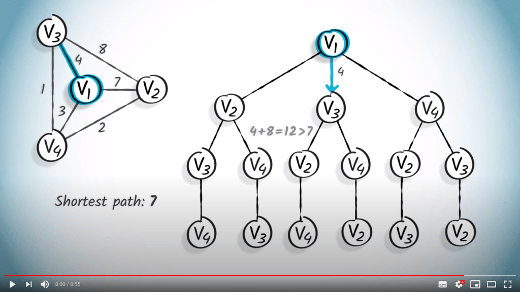 The branch-and-bound algorithm explores the tree of possibilities (in the case of the traveling salesman, the tree of possible paths). To do this, it uses a BFS-like algorithm. At each vertex it encounters, it tries to estimate an interval (as narrow as possible) estimating the length of a shorter path obtained from the branch of the tree where it currently is.