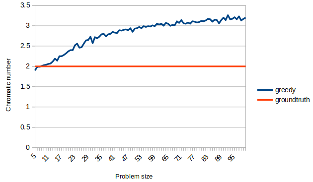 In order to evaluate a bit more that aspect, we are going to evaluate the solutions found using the greedy approach on bipartite graphs, for which we know the chromatic number is always 2: